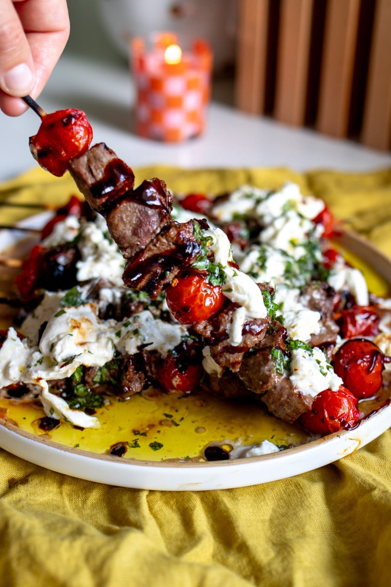 Balsamic Boneless Petite Sirloin Steak Skewers with Burrata