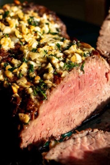 - SLICE & SERVE: Using a very sharp knife, slice the tenderloin into coins. Finish with flaky salt if desired and serve with the garlic butter or your favorite sauce.
